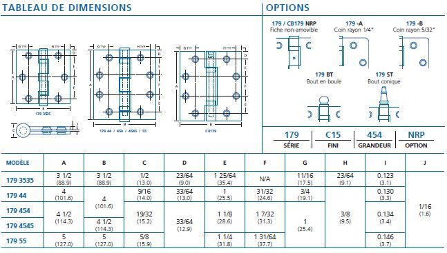 Les charnières gabarit sont faites de matériaux de qualité choisis, de supports en acier et de finis plaqués haut de gamme. Elles sont de poids standard ou lourd, ont 5 articulations, des fiches amovibles verrouillables, des bouts supérieurs standard plats et des bouts inférieurs repoussables. Les charnières ont 4 coins carrés et sont fournies avec toutes les vis à bois et vis mécaniques sous-taillées requises.